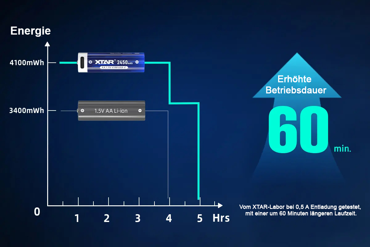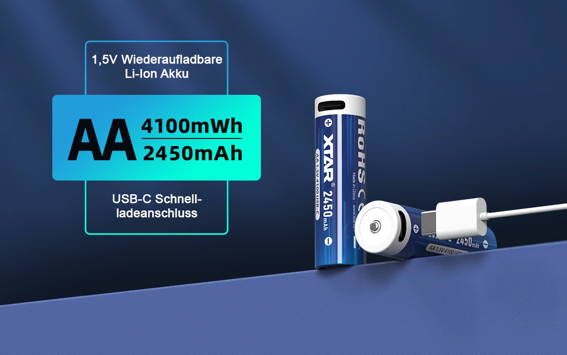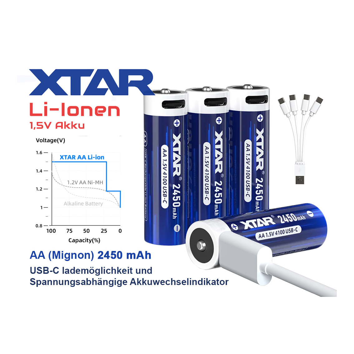 XTAR AA 1,5 V 2450 mAh litij-ionska baterija z USB-C se lahko polni več kot 1200-krat, kar zmanjšuje porabo baterije in odpravlja potrebo po dodatni polnilni opremi – idealno za okoljsko ozaveščene uporabnike.