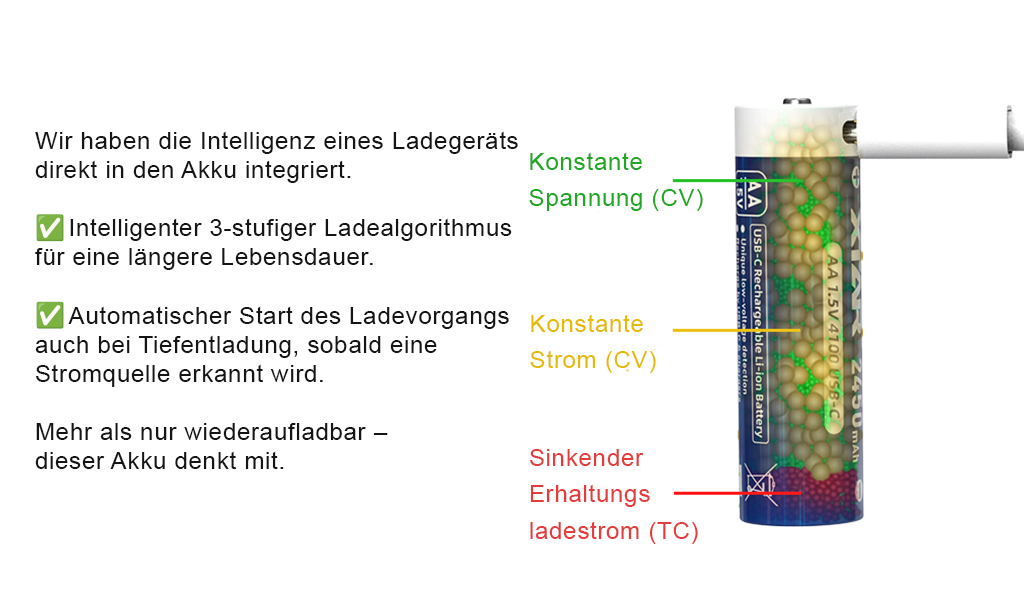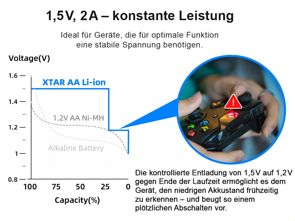 Linearna krivulja praznjenja pomeni, da napetost baterije med uporabo gladko in predvidljivo pada (podobno kot pri NiMH baterijah). Opozorilo o zamenjavi baterije je zanesljivo – ne glede na napravo ali njeno minimalno delovno napetost – in na koncu ni nenadnega padca napetosti. To zagotavlja varno delovanje skozi celotno obdobje uporabe.
