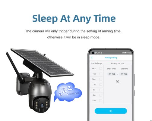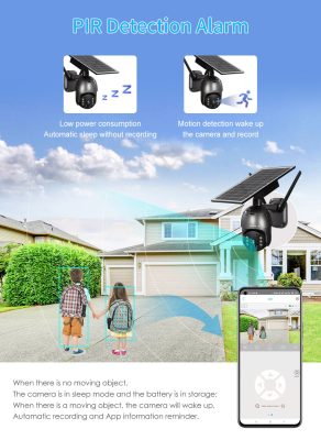 | Hauptmerkmal | 1/2 ″ progressiver CMOS-Sensor, Vollfarb-Schwarzlicht Eingebautes Solarpanel und wiederaufladbare Batterien 1080P hohe Auflösung APP unterstützt iOS / Android-System Super niedriger Stromverbrauch Eingebautes Mikrofon und Lautsprecher, Unterstützung für bidirektionale Kommunikation Alarm mit Ton und Licht Drehen der Kamera aus der Ferne Nachtaufnahme mit Weißlicht (Farbvideo) oder IR-Licht (Schwarzweißvideo) 4G-Konnektivität und Live-Videoanzeige Unterstützung für Cloud- oder TF-Kartenspeicher Metallgehäuse, IP66 wasserdicht |