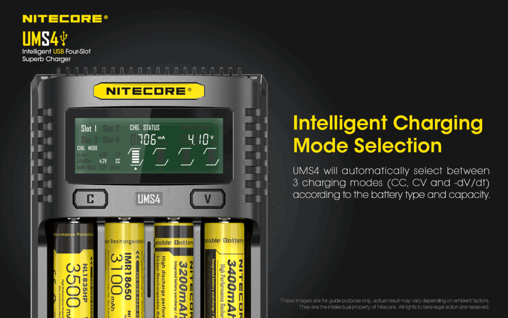NiteCore UMS4 ist ein universelles Mikroprozessor-Ladegerät, das für fast alle Arten von wiederaufladbaren Batterien auf dem Markt geeignet ist. Das UMS4-Ladegerät erkennt automatisch den Typ des eingelegten Akkus, sei es der neueste Typ Li-Ion-Akku, Ni-Mh oder eine ältere Ni-Cd-Akkuzelle. Bei manueller Auswahl ist sogar das Laden von LiFePo4-Akkus möglich.